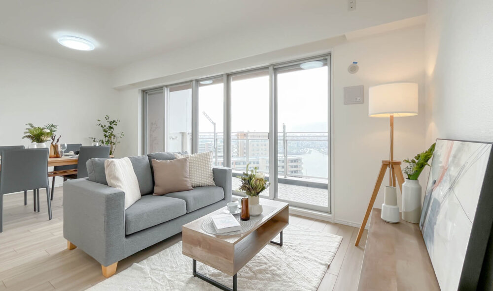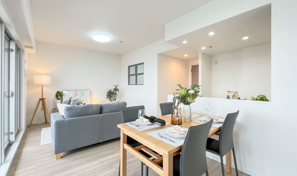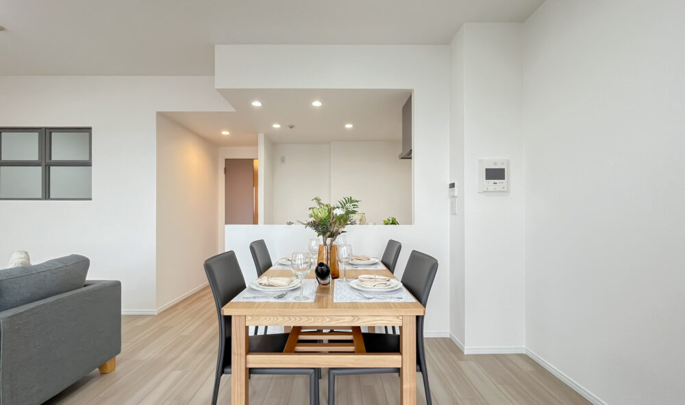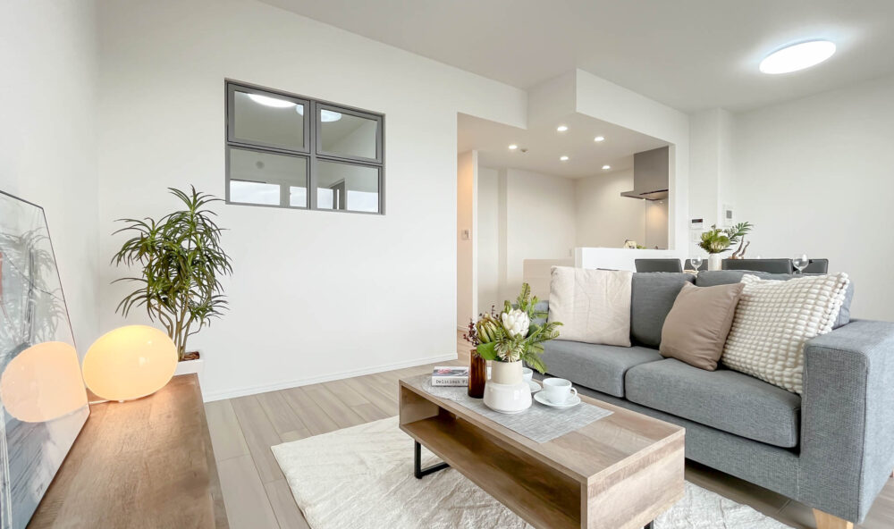 トレンドのアイアンの室内窓がポイントの、シンプルで解放感のある空間です。家具の木部・ソファの張地は、床材と明度・彩度をしっかりあわせることで完成度の高いコーディネーションとなります。